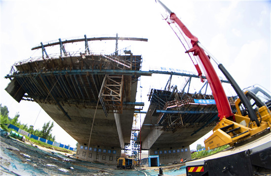 周口北環(huán)跨賈魯河大橋是我市在建重點(diǎn)工程,全長(zhǎng)904米,其中主橋總長(zhǎng)286米,共3跨,采用懸澆法施工。7月16日中午,記者在工地看到,經(jīng)過(guò)一年多的施工,工程完成80%左右,為了保障工期和質(zhì)量,工人們冒著酷暑,在跨河的兩列橋墩上,忙碌著澆鑄施工,隨著澆鑄橋體的延伸,預(yù)計(jì)年底橋體完成合攏。