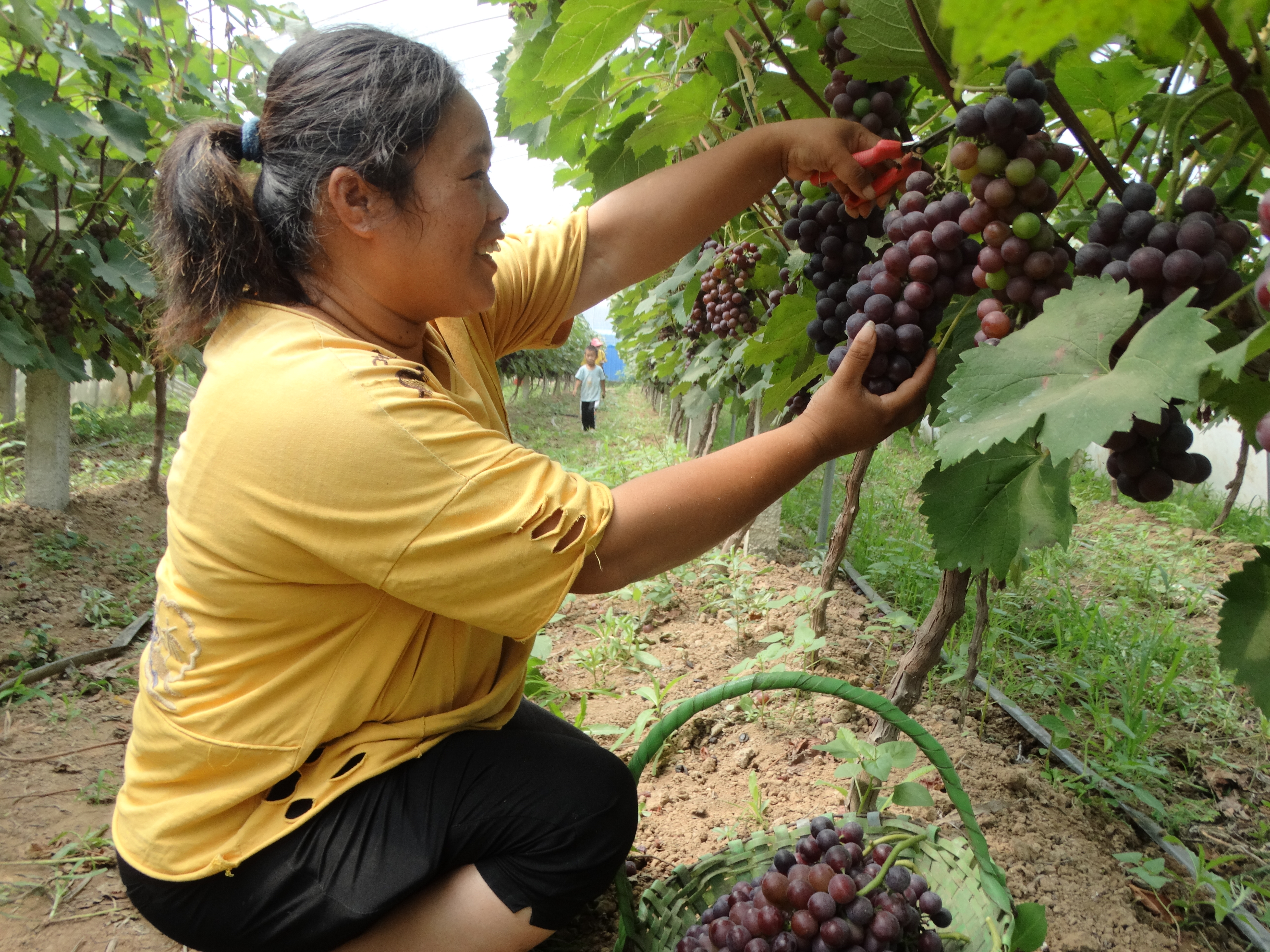 7月20日,沈丘縣周營鎮(zhèn)王寨村返鄉(xiāng)農(nóng)民工王紅兵創(chuàng)辦的大棚生態(tài)葡萄采摘園基地內(nèi),當(dāng)?shù)夭簧偃罕娫隗w驗休閑采摘葡萄、拍視頻的樂趣。