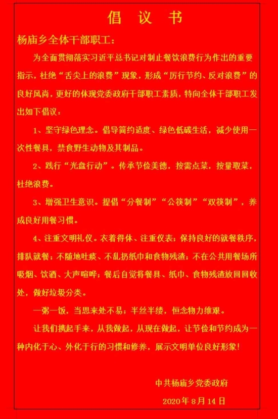 太康:楊廟鄉(xiāng)黨委政府發(fā)出倡議堅(jiān)決制止餐飲浪費(fèi)行為