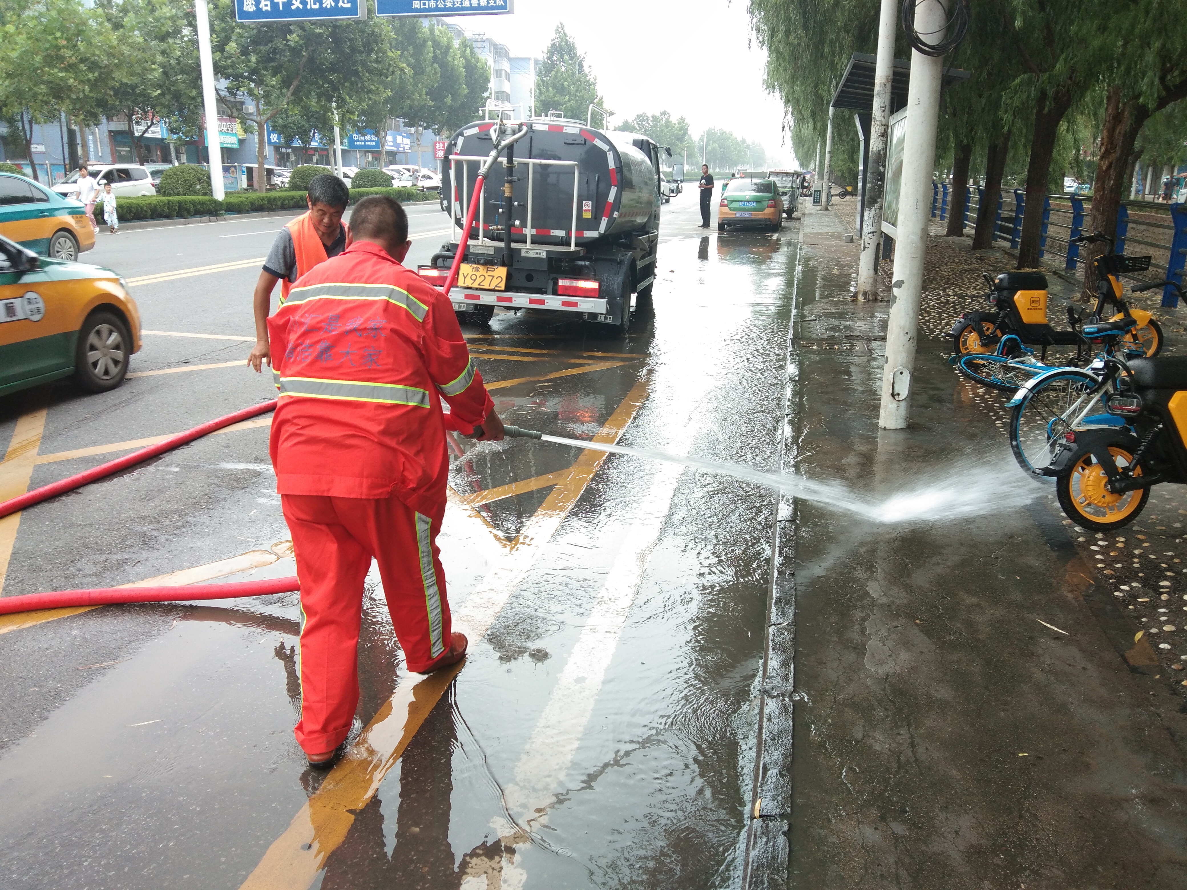 8月23日上午,記者在周口中心城區(qū)大慶路與交通大道交叉口附近看到,工作人員正在對一些人工難以清掃干凈的路面進行高壓沖洗作業(yè),為“創(chuàng)衛(wèi)”貢獻力量,讓市民有一個良好出行環(huán)境。