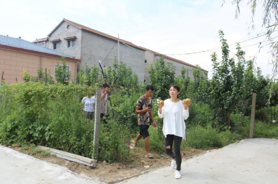 上任伊始,許天勇充分利用水域面積大的優(yōu)勢(shì),發(fā)展鄉(xiāng)村旅游經(jīng)濟(jì),把整理出來(lái)的水域種上了荷花,放上了魚(yú)苗,在村里還建起了四橦民宿建筑,在廣場(chǎng)邊村里統(tǒng)一管理的一處民宿內(nèi)興辦了特色餐飲,讓來(lái)這里垂釣的人有得玩、有得吃、還有得住。許天勇指著許莊村頭的一處坑塘說(shuō):“這是我們治理出來(lái)比較大的一處,鎮(zhèn)里牽頭在坑塘兩側(cè)建起了扶貧富民冷庫(kù),還建成1200多平方米的游園、近3000平方米的垂釣園,另外,村里又把平整出14.2畝土地種上的梨樹(shù),承包給村民進(jìn)行果蔬間作,現(xiàn)在梨樹(shù)已進(jìn)入盛果期,預(yù)計(jì)今年凈收益4萬(wàn)元左右?!?/p>