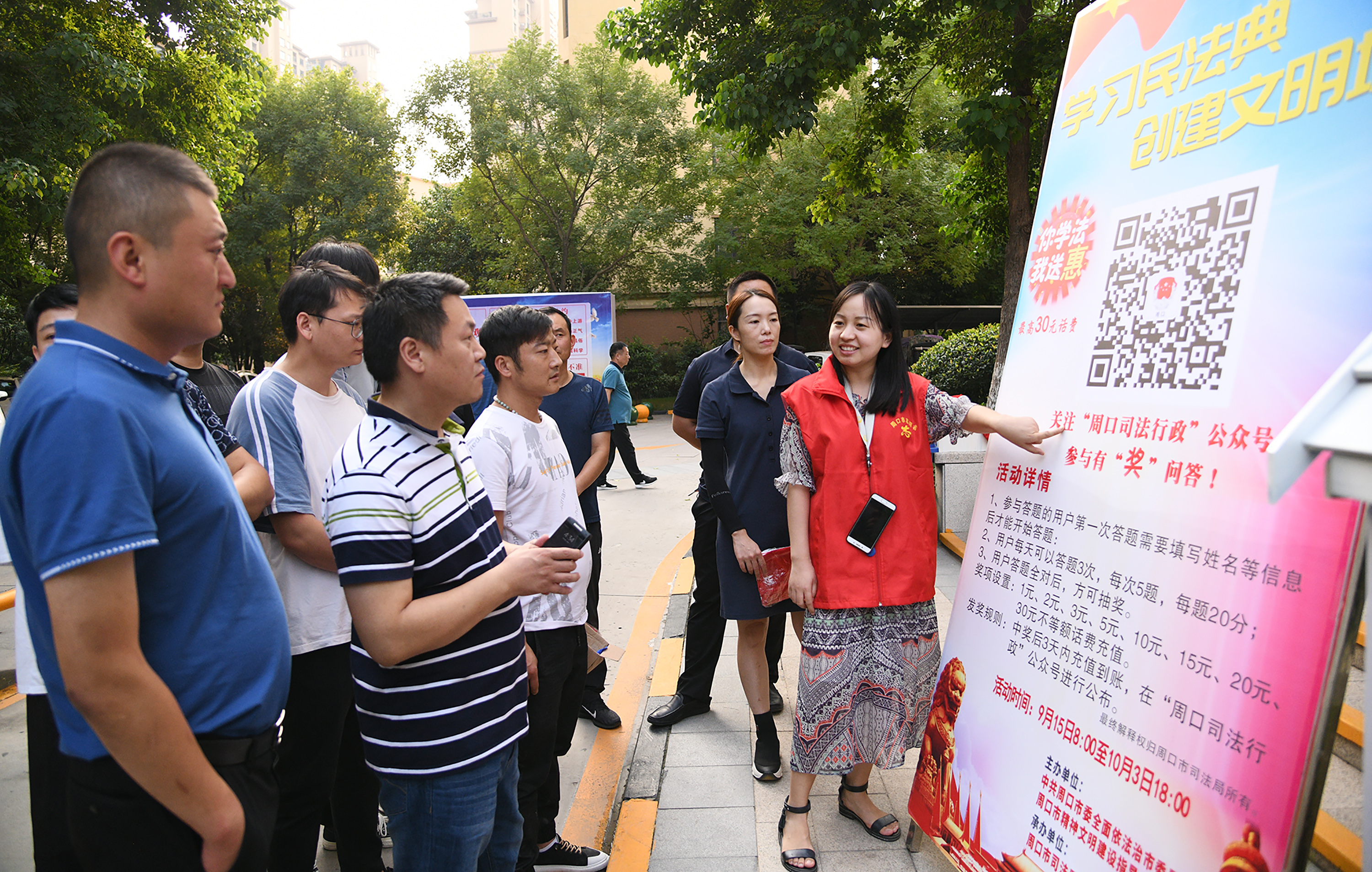 周口日?qǐng)?bào)·新周口客戶端 我國(guó)于今年5月份頒布的《民法典》是一部被譽(yù)為“社會(huì)生活的百科全書(shū)”的法律,涉及民生諸多方面。近日,市司法部門(mén)深入社區(qū),以學(xué)法有獎(jiǎng)形式,宣傳這部和老百姓生活密切相關(guān)的法律。圖為市司法部門(mén)工作人員在建業(yè)森林半島社區(qū)宣傳。記者 梁照曾 攝