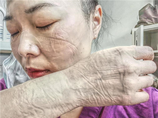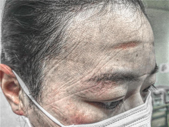 因?yàn)樾鹿诜窝椎膹?qiáng)傳染性,胡奔奔每次去病區(qū)上班都要全副武裝,而且為保證在6個(gè)小時(shí)的工作時(shí)間內(nèi)不被暴露,不能去衛(wèi)生間,不能喝水,還要穿上成人紙尿褲以防萬(wàn)一。這樣下來(lái),汗?jié)褚路浅J拢蚁掳嗪竺摰舴雷o(hù)裝備后,她原本清秀白皙的臉上,滿(mǎn)是深深的皺褶,久久難以恢復(fù),惹人心疼。給家人報(bào)平安時(shí),胡奔奔甚至不敢視頻聊天,只能語(yǔ)音安慰家人。