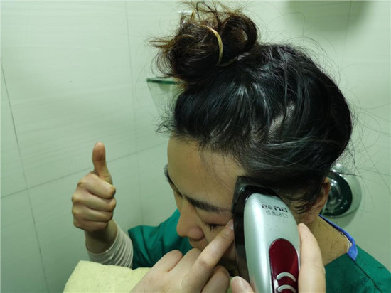 出征武漢之前,為減少感染自己、感染別人的風(fēng)險(xiǎn),出生于1991年、和同齡人一樣愛(ài)美的胡奔奔毅然決定同意剃去一襲披肩長(zhǎng)發(fā)。這頭秀發(fā),胡奔奔留了多年,曾經(jīng)看得跟生命一樣珍貴,但疫情險(xiǎn)惡,她義無(wú)反顧。