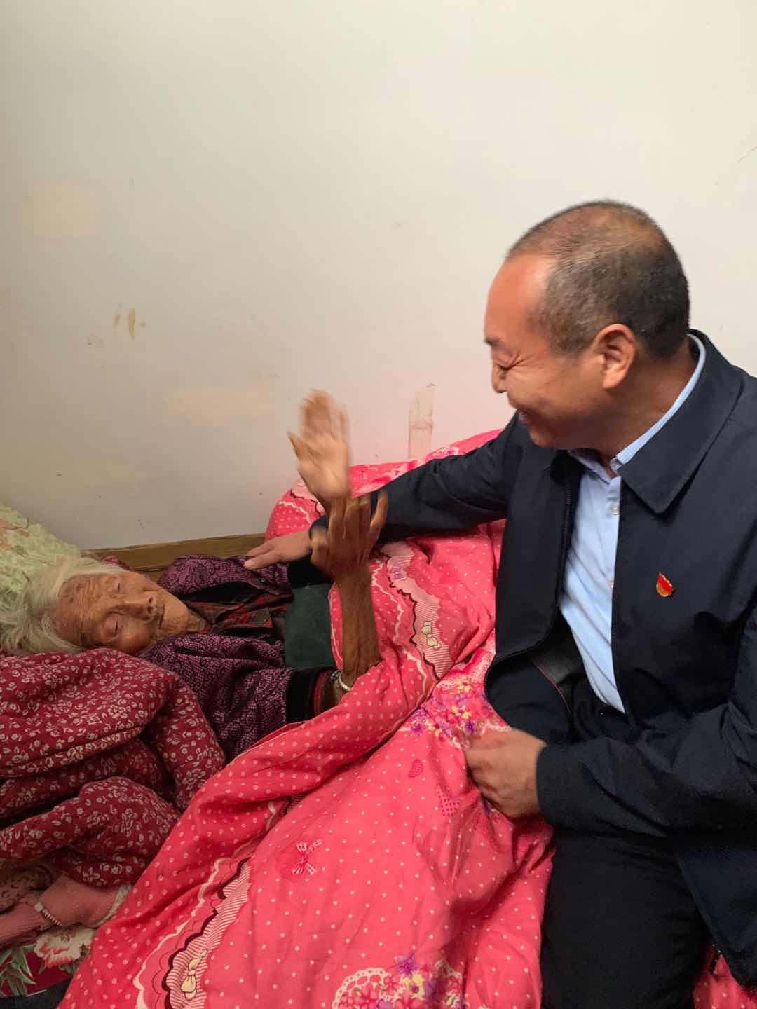 這天,方凱一行帶著嶄新的棉衣、大米、食用油等禮品,首先來到磨臺(tái)村看望107歲的老人胡有蘭。躺在床上的老人雖年逾百歲,一眼看見方凱,就認(rèn)出來了,激動(dòng)地說:“孩子,你又來了?”說著,就急忙拉住方凱的手,緊緊地握著??蠢先瞬环奖阕饋?,方凱便坐在老人身邊,笑著說:“是的。娘,兒子來看您啦!”