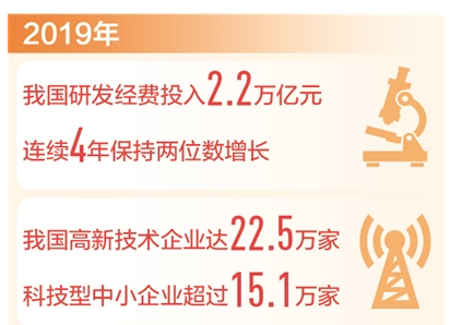 科技創(chuàng)新助推高質(zhì)量發(fā)展,我國創(chuàng)新型經(jīng)濟格局初步形成。截至2019年,全國高新技術企業(yè)達到22.5萬家,科技型中小企業(yè)超過15.1萬家。作為培育高新技術產(chǎn)業(yè)的重要載體,高新區(qū)5年來量質(zhì)同步提升。2019年,169家國家高新區(qū)生產(chǎn)總值達12萬億元,經(jīng)濟總量占全國的1/10以上。