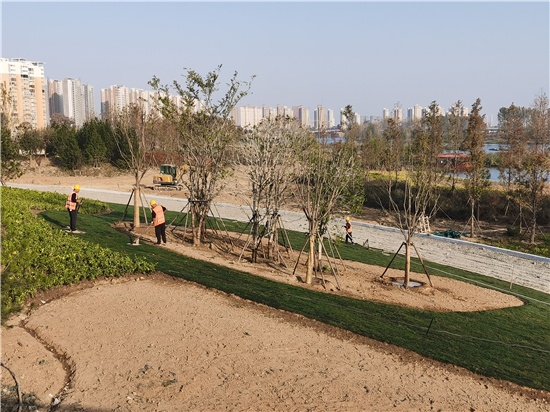 11月11日,在中心城區(qū)沙潁河北岸周口大道至八一大道段生態(tài)改造工程EPC項(xiàng)目施工現(xiàn)場(chǎng),施工人員正在進(jìn)行地被植物的種植、綠化樹木的養(yǎng)護(hù)。