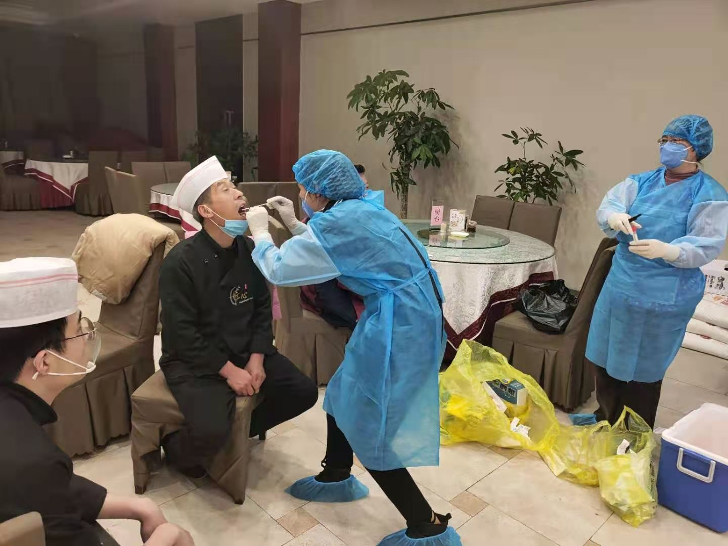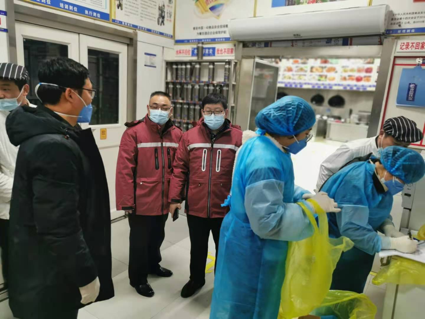 為助力第一屆周商大會圓滿成功,市衛(wèi)生健康委抽調(diào)近百名調(diào)精兵強將組成衛(wèi)生保障專班開展衛(wèi)勤保障工作。圖為工作人員在市委黨校迎賓館和體育賓館餐廳對后廚人員做核酸檢測及開展冷鏈食品消毒。