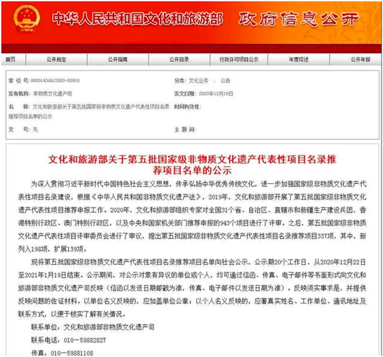 據(jù)了解,2019年,文化和旅游部開(kāi)展了第五批國(guó)家級(jí)非物質(zhì)文化遺產(chǎn)代表性項(xiàng)目推薦申報(bào)工作。2020年,文化和旅游部組織專家對(duì)全國(guó)31個(gè)省、自治區(qū)、直轄市和新疆生產(chǎn)建設(shè)兵團(tuán),香港特別行政區(qū)、澳門(mén)特別行政區(qū),以及中央和國(guó)家機(jī)關(guān)部門(mén)推薦申報(bào)的943個(gè)項(xiàng)目進(jìn)行了評(píng)審。之后,第五批國(guó)家級(jí)非物質(zhì)文化遺產(chǎn)代表性項(xiàng)目評(píng)審委員會(huì)進(jìn)行了審議,提出第五批國(guó)家級(jí)非物質(zhì)文化遺產(chǎn)代表性項(xiàng)目名錄推薦項(xiàng)目337項(xiàng),其中,新列入198項(xiàng),擴(kuò)展139項(xiàng)。