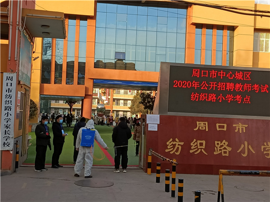 1月10日,周口市中心城區(qū)2020年公開招聘教師考試,考試時(shí)間是一天。當(dāng)天下午,記者在周口市中心城區(qū)2020年公開招聘教師考試紡織路小學(xué)考點(diǎn)看到,工作人員在做好考務(wù)工作的同時(shí)還做好疫情防控工作。圖為工作人員做防疫消殺。