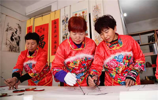 在建豪工作室的斜對面,是50歲村黨支部書記、村文聯(lián)主席盧全禮的書畫工作室。盧全禮書畫兼擅,還會武術(shù)、木刻、舞獅子,是附近有名的才子。記者看到,他為太康縣第二屆農(nóng)民豐收節(jié)創(chuàng)作的中國畫《黃土地的心聲》,以該村嗩吶吹奏藝人幸福而夸張的演出情景,歌頌農(nóng)村脫貧攻堅取得的巨大成果,極具鄉(xiāng)土氣息。在他的畫室,滿身文藝范兒的五西村民,正以新時代松鶴延年吉祥農(nóng)民畫,齊心打造中原畫鶴第一村。經(jīng)過培訓(xùn)的農(nóng)村大嫂大媽執(zhí)筆齊描畫,一時鶴鳴九皋,翩翩欲飛。