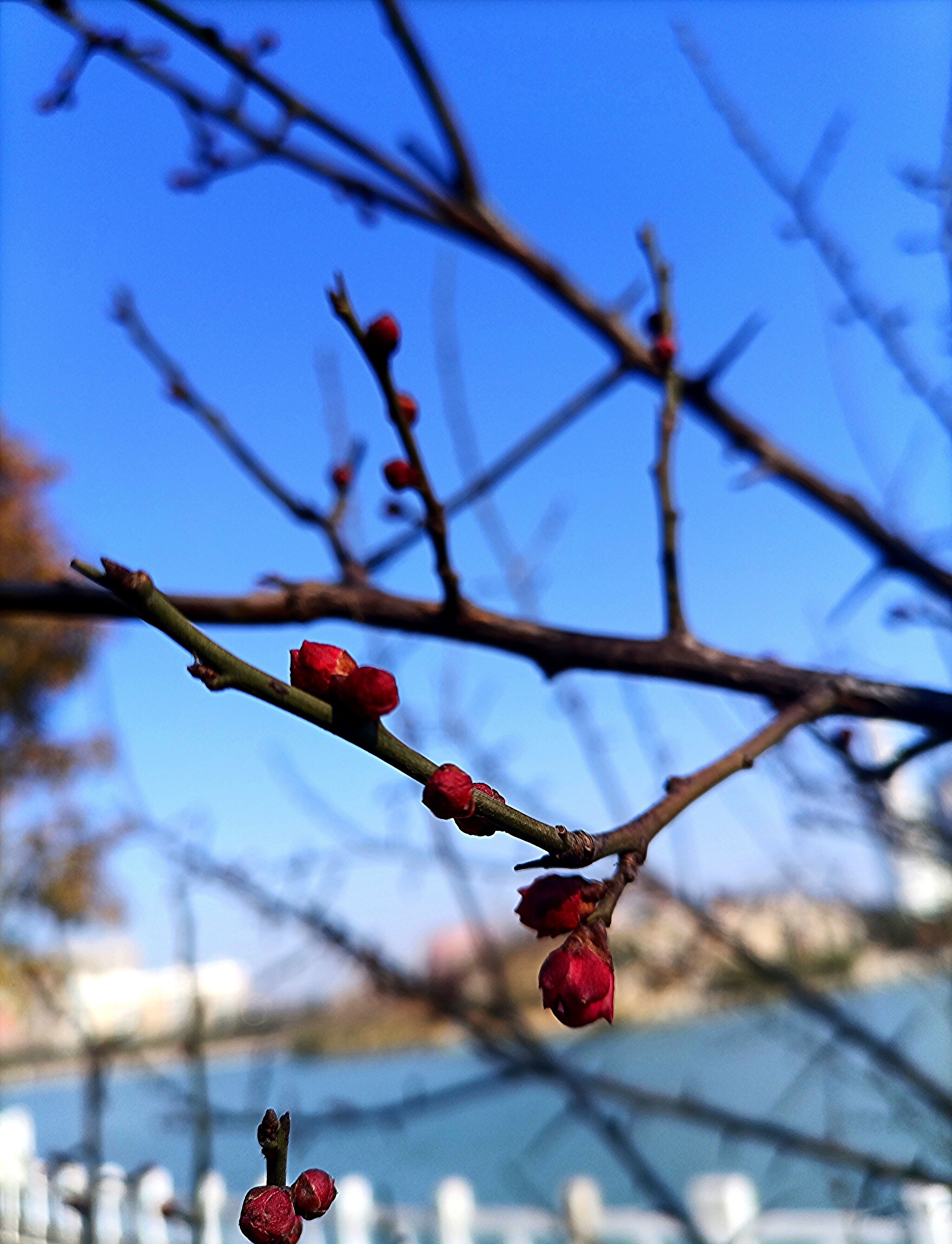 1月14日,我市天氣晴朗,周口公園環(huán)湖步道邊上的梅樹上,一朵朵含苞待放的梅花嬌艷欲滴,就像一個個羞怯的小小舞者,正在為登臺綻放而積攢力氣和勇氣。