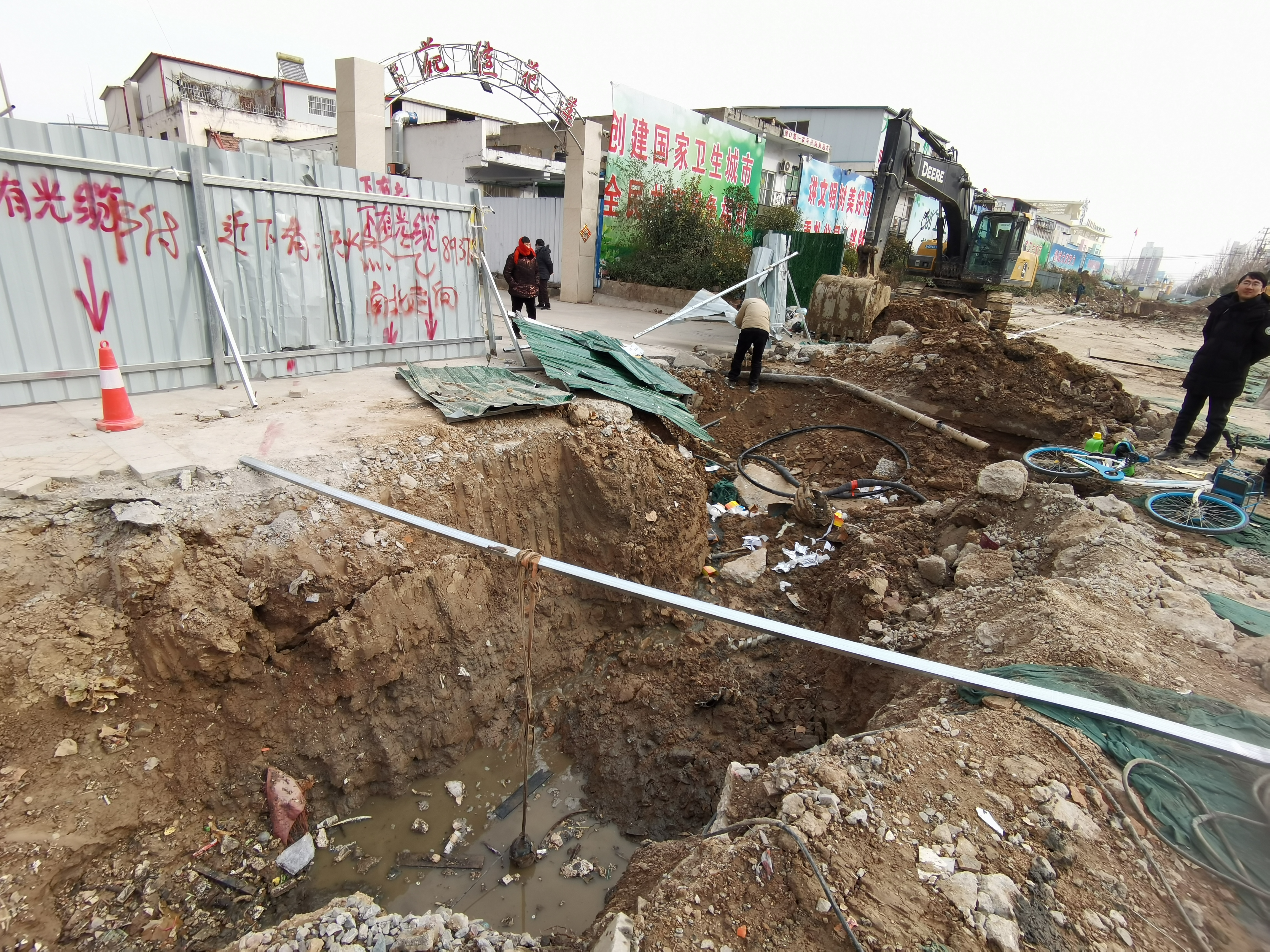當日上午,在蓮花路中段蓮花佳苑小區(qū)門前的地下電纜外破現場,一輛挖掘機停在 外破點的旁邊,挖斷的電纜經過搶修后裸露在一旁?,F場施工人員介紹,此處正在進行箱涵施工,預計春節(jié)前能夠完工。