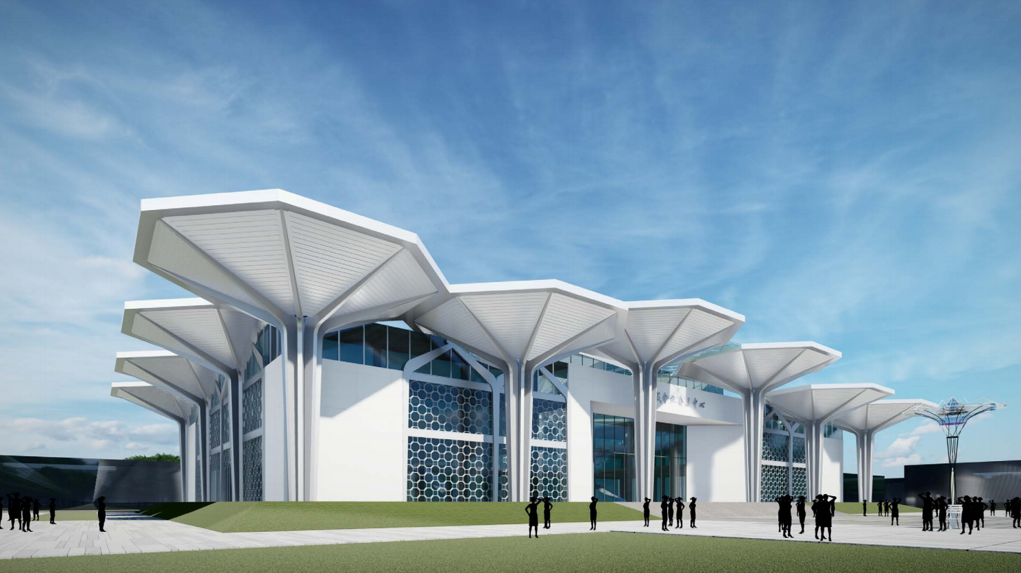 鄲城縣傘業(yè)產(chǎn)業(yè)園電子商務(wù)服務(wù)中心項(xiàng)目是鄲城縣傘業(yè)全產(chǎn)業(yè)鏈展銷的窗口項(xiàng)目、展示項(xiàng)目。會(huì)展中心的設(shè)計(jì)概念以“傘啟鄲興”為主題,基于對本土特色文化的深入解讀、同時(shí)結(jié)合“傘”的具體特征,提煉傘蓋、傘骨、傘柄的特殊形象為基本元素。建筑主立面以八個(gè)巨大傘形構(gòu)架依次展開,巨型的尺度、新穎的造型有極強(qiáng)的昭示性,裝飾幕墻八邊形的單元分割也隱喻了傘蓋的造型,創(chuàng)新的視覺形象為傘業(yè)產(chǎn)業(yè)園增加了新的注解。會(huì)展中心整體的建筑風(fēng)格充分展示了鄲城傘業(yè)產(chǎn)業(yè)園的核心價(jià)值,形成獨(dú)具特色的地標(biāo)形象。