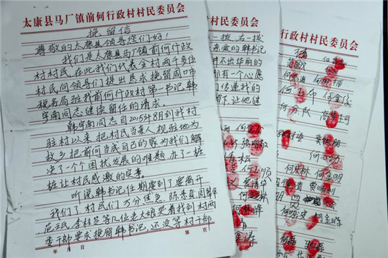 2018年,組織上考慮到韓宇南已經(jīng)在第一書記的崗位上工作了3年多,決定換他回原單位工作。前何村的群眾聽到這個(gè)消息后,多次前往馬廠鎮(zhèn)政府請?jiān)福罅粝马n宇南繼續(xù)擔(dān)任前河村支部書記,何心功等99位村民還向國家稅務(wù)總局周口市稅務(wù)局、太康縣委縣政府寫了一封“挽留信”,并按下了99個(gè)鮮紅的手印。