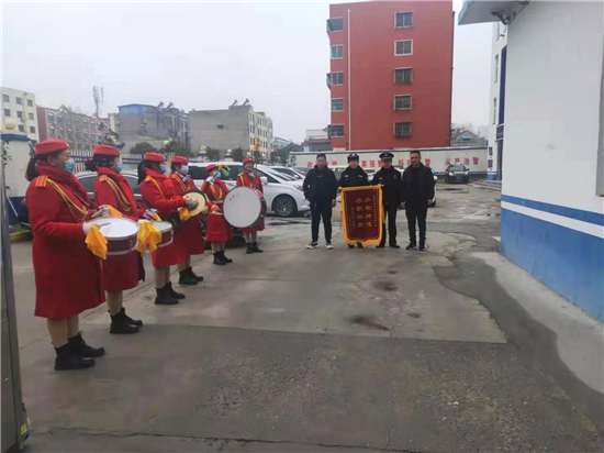 2月25日上午,項城市公安局水寨派出所門口鑼鼓齊鳴,異常熱鬧,兩名男子手持一面寫有“辦案神速、盡職盡責(zé)”字樣的錦旗,送給派出所民警,深表謝意。