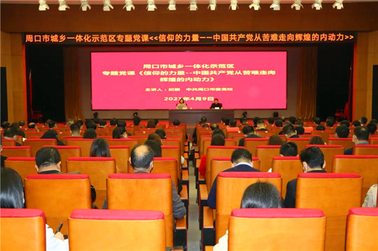 為貫徹落實(shí)習(xí)近平總書記黨史學(xué)習(xí)教育動(dòng)員大會重要講話精神,全面推進(jìn)全區(qū)黨史學(xué)習(xí)教育工作,4月9日上午,周口市城鄉(xiāng)一體化示范區(qū)組織專題黨課學(xué)習(xí),邀請中共周口市委黨校黨史黨建教研室主任,副教授紀(jì)穎講授《信仰的力量——中國共產(chǎn)黨從苦難走向輝煌的內(nèi)動(dòng)力》專題黨課,示范區(qū)副處級以上干部、區(qū)直全體黨員干部、鄉(xiāng)、辦、站、所負(fù)責(zé)人、全體村(社區(qū))支部書記參加會議。