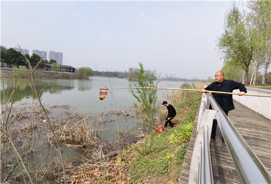 4月16日,周口植物園管理人員及保潔人員在打撈漂浮在湖水中的垃圾及枯草。為了給市民提供一個干凈、優(yōu)美的園內環(huán)境,植物園的工作人員每天都會清理打撈湖水中的雜物。