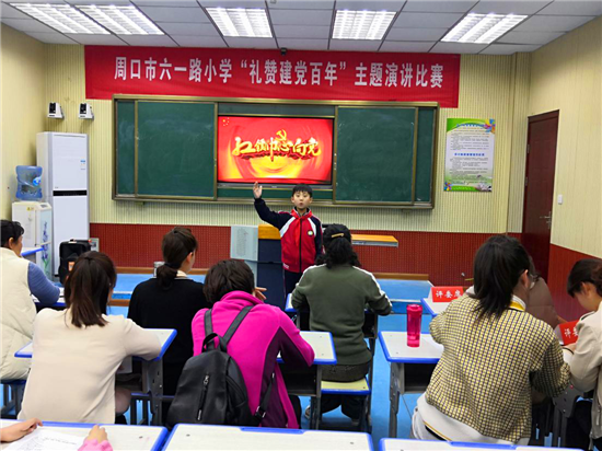 “中國共產(chǎn)黨是偉大的黨、崇高的黨、奮進(jìn)的黨,百年歷程、百年輝煌;沒有共產(chǎn)黨就沒有新中國;我驕傲,我是中國人;我們要努力學(xué)習(xí)、奮發(fā)向上、為黨增光、為黨添彩……”周口市六一路小學(xué)舉辦“禮贊建黨百年”主題演講比賽,參賽選手回顧黨的光輝歷程、弘揚黨的豐功偉績,表達(dá)對中國共產(chǎn)黨的熱愛和贊頌,以各自獨特的見解給師生們進(jìn)行了一次生動的理想信念教育。