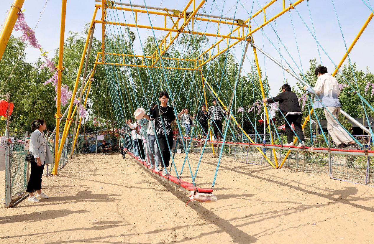網(wǎng)紅秋千,登上七彩獨木秋千橋上,感受飛翔,是孩子在釋放天性的天堂,也讓大人在樂嗨中追憶童年。讓學習煩惱、壞天氣、疫情……都在一次次的彈跳中甩掉吧!
