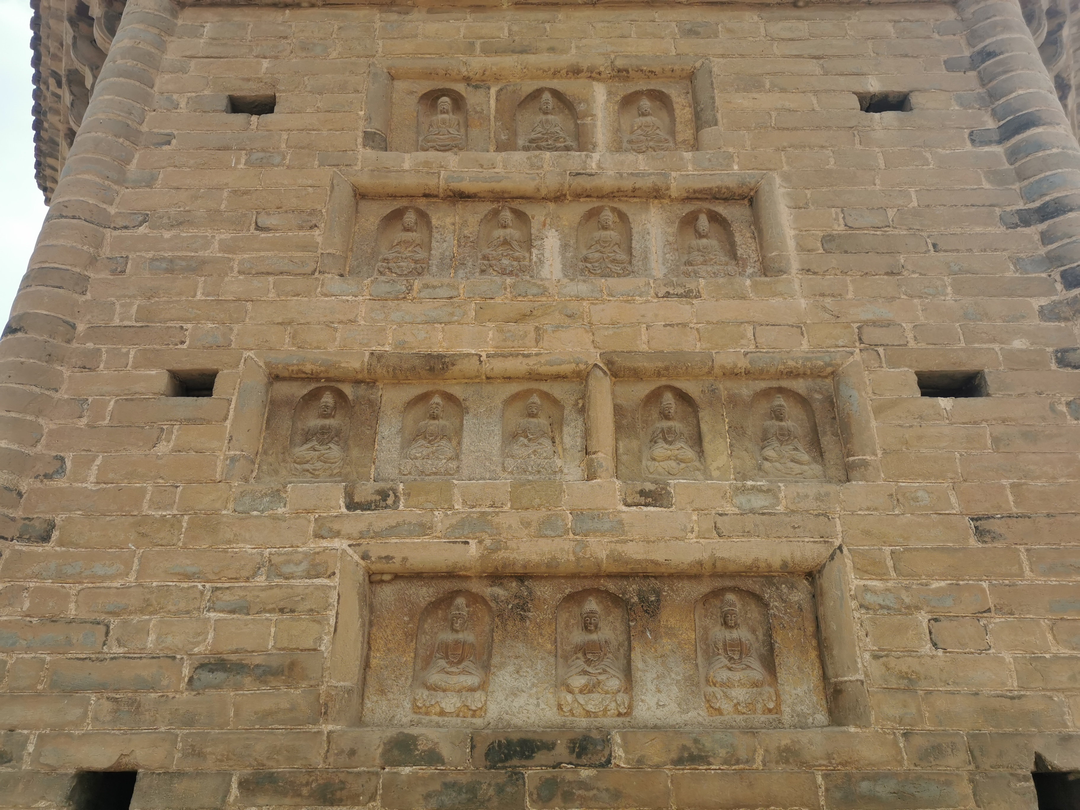 太康壽圣寺塔,高28.3米,為六角形七級(jí)樓閣式磚塔,上有塔剎。塔身第七層為實(shí)心,一至六層為空心,但層與層相隔互不相通,在南面辟圭形門,檐下均置磚雕斗拱。塔身南面正墻除第七級(jí)外均有真門,每層檐下都飾有磚雕斗拱,塔身共嵌砌石雕佛像211尊、石刻題記14方。