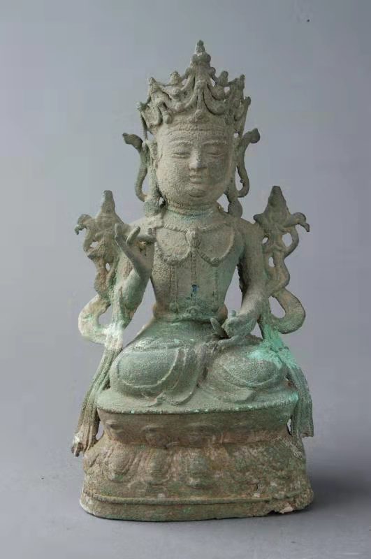 商水壽圣寺塔,高41.5米,為九級(jí)樓閣式磚塔。塔體從底至頂漸收勻稱,平面呈正六邊形。塔頂用鑄鐵鑄成葫蘆形寶頂,給人以挺拔雋秀之感。塔的層檐收放尺寸設(shè)計(jì)精妙,既保護(hù)了塔墻免遭雨雪侵蝕,又使塔體顯得莊重肅穆。塔身諸層外壁皆辟有圓券門、破子欞假窗,塔身各角砌出倚柱,檐下密布磚雕斗拱。塔內(nèi)砌出塔心室和盤旋梯道,可逐層登高至塔頂。塔第一層,南面辟門,門楣上刻“明道二年癸酉歲三月一日丙寅時(shí)戊寅日,葬舍利院主。僧□□建□□功德塔”。說(shuō)明建塔的年代是北宋。塔室為穹窿頂。東南、西南兩壁有破子欞盲窗各1個(gè),西壁另辟一拱券門,有踏道可登至第二層塔心室。第二層,南面辟門,東南、西南兩壁各砌一盲窗,東壁另辟一門可沿踏道進(jìn)入第三層。以上諸層大同小異。第四層,塔心室內(nèi)北墻嵌石雕佛像3尊,兩尊盤膝正面像,一尊盤膝背面像。剎柱下端插入塔心室,上端置鐵質(zhì)寶瓶,在不同部位還發(fā)現(xiàn)“風(fēng)調(diào)雨順”“國(guó)泰民安”“周王千歲千千歲”“大明嘉靖二十八年九月吉日”“河南周府施舍西華小瑤集壽圣寺塔一座”等字樣,這些都說(shuō)明了明代嘉靖年間,又重修了塔身。1998年9月,在維修該塔時(shí),在天宮清理出明代銅佛像3尊,白釉瓷盤1只,白釉黑花瓷碗、白釉褐花瓷碗各1個(gè),刻印大彌陀經(jīng)1卷。銅佛像高約20厘米,其中一尊有“嘉靖三十一年”字樣,這一時(shí)期的周王為周敬王朱在鋌,這說(shuō)明嘉靖三十一年周敬王朱在鋌為祈福曾將這批器物和經(jīng)卷,置入了塔頂?shù)蔫F質(zhì)寶瓶中。
