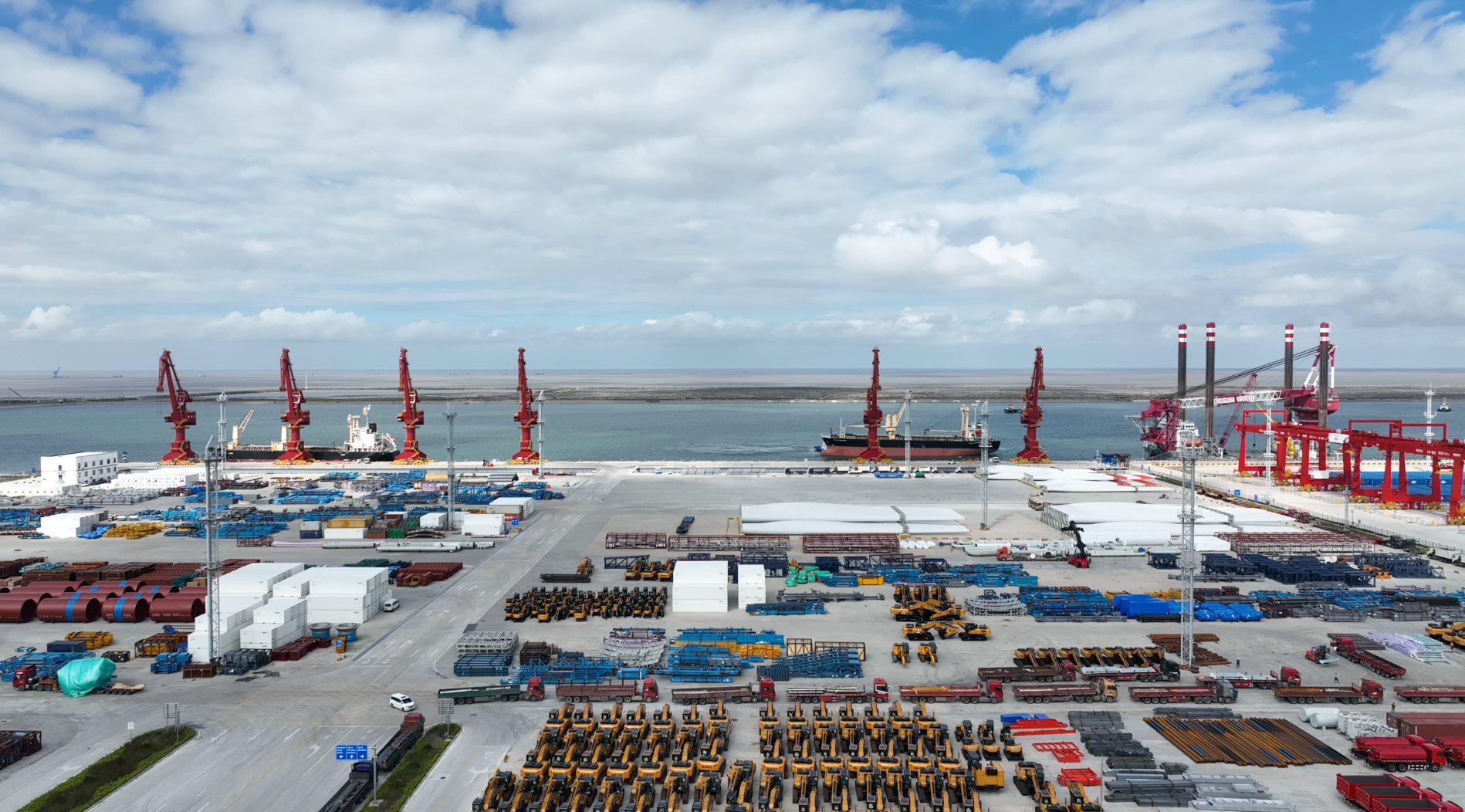 站在呂四起步港港區(qū)綜合樓的最高處,極目遠(yuǎn)眺,港口景觀盡收眼底。港池父親般寬闊的臂膀,將一艘艘越洋而來的萬噸巨輪攬入懷中;挖掘機(jī)和風(fēng)機(jī)葉片被“碼”得整整齊齊,正待裝船出口;機(jī)器不停運轉(zhuǎn),給??康拇谎b卸貨物;重型貨柜車進(jìn)出有序、川流不息。而令人驚奇的是,偌大的港口幾乎沒有看到一個工作人員。