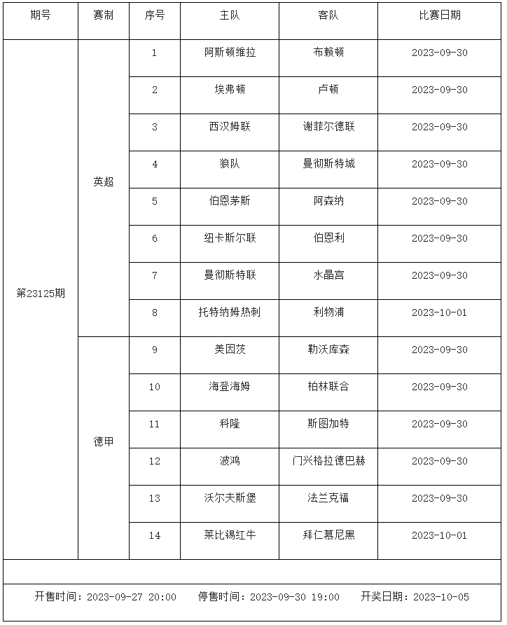 萊比錫周中德國杯3:2擊敗韋恩,各項賽事取得6連勝,出色的防守能力是萊比錫在今夏大失血之后依舊能保持競爭力的關(guān)鍵。在德甲賽季初的5場比賽里萊比錫打進14球僅失4球,是目前德甲失球最少的球隊之一,以亨利西斯+西馬坎+盧科巴+勞姆的后防組合功不可沒。拜仁上輪聯(lián)賽7:0血洗波鴻,凱恩上演帽子戲法,目前打進7球排在德甲射手榜第2的位置。目前隊內(nèi)主力前腰穆西亞拉因傷無法出戰(zhàn),舒波莫廷替代他的位置,和科曼、薩內(nèi)以及凱恩梳理球隊攻擊線,球隊的替補席上還有穆勒、格雷茨卡和格拉布里等眾多進攻好手,球隊主帥圖赫爾能夠打出的牌還有不少。兩支球隊在本賽季初的德國超級杯中有過交手,當時拜仁以0:3的比分不敵萊比錫,當時凱恩還未加入球隊,并非最強陣容出戰(zhàn),經(jīng)歷了多場比賽的磨合之后,拜仁有信心能夠復仇對手全身而退。足球彩票勝負游戲(14場和任選9場)第23125期賽程: