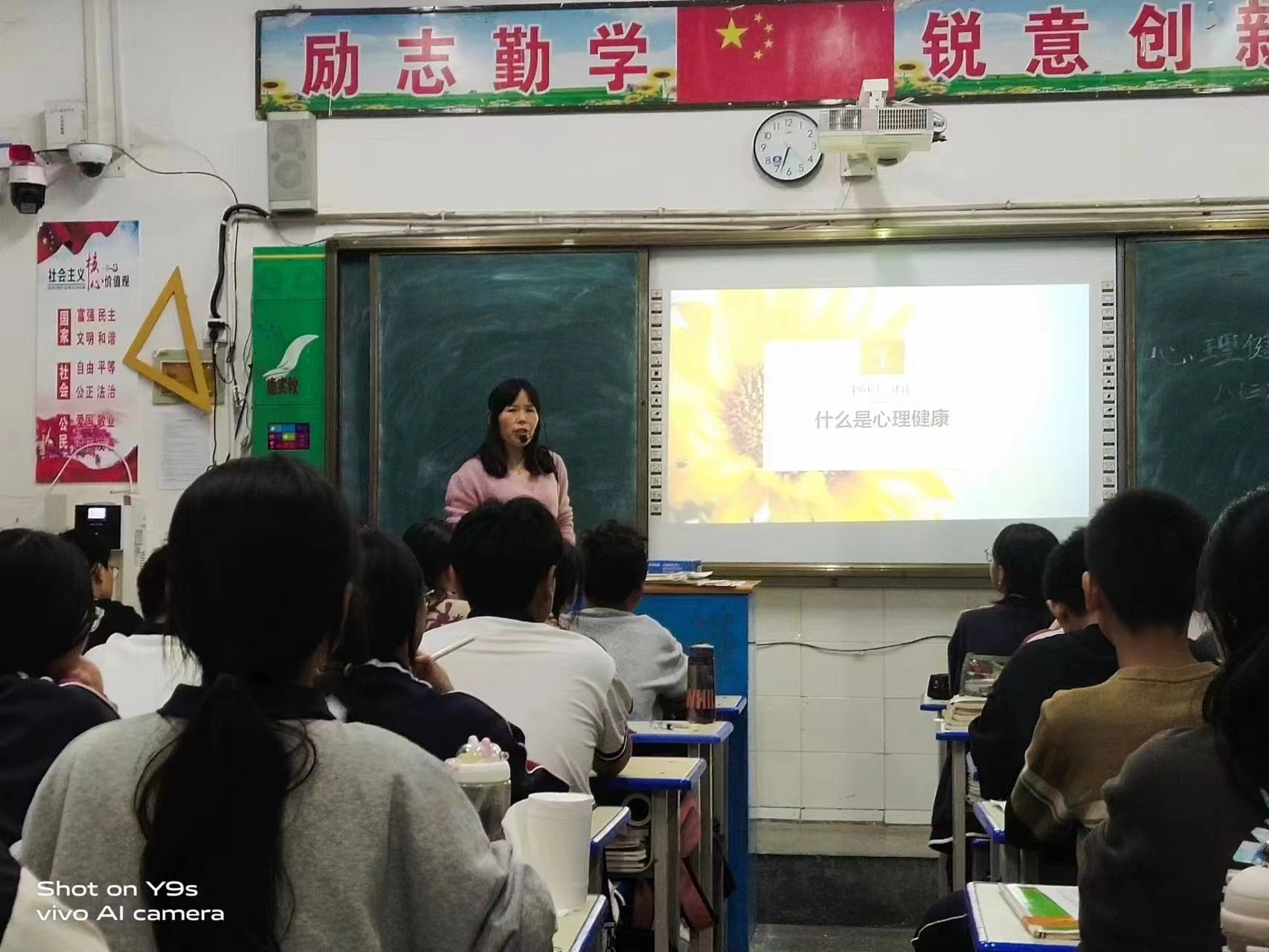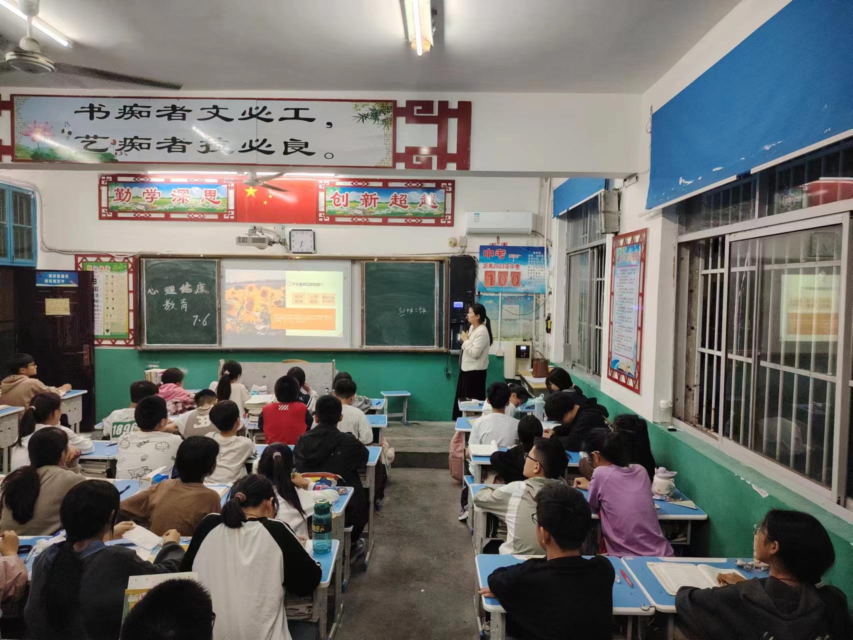 學(xué)校政教處提前制作好課件,各班班主任充分利用第一節(jié)晚自習(xí),從“什么是心理健康”“中小學(xué)生心理健康的標(biāo)準(zhǔn)”“增進(jìn)心理健康的途徑”三個方面進(jìn)行認(rèn)真講解,引導(dǎo)學(xué)生合理調(diào)節(jié)自己的心理,啟示學(xué)生日常生活中不僅需要有健康的體魄,而且更需要有健康的心靈,并正確認(rèn)識自我、接納自我,享受美好人生。特別在講到“增進(jìn)心理健康途徑”這一環(huán)節(jié)時,學(xué)生積極發(fā)言,師生頻繁互動,最終讓學(xué)生們明白對于同一件事情,個人想法不同帶來的情緒也不相同,要保持樂觀的生活態(tài)度,即使遭遇到挫折、失敗,依然能夠保持積極向上的情緒。