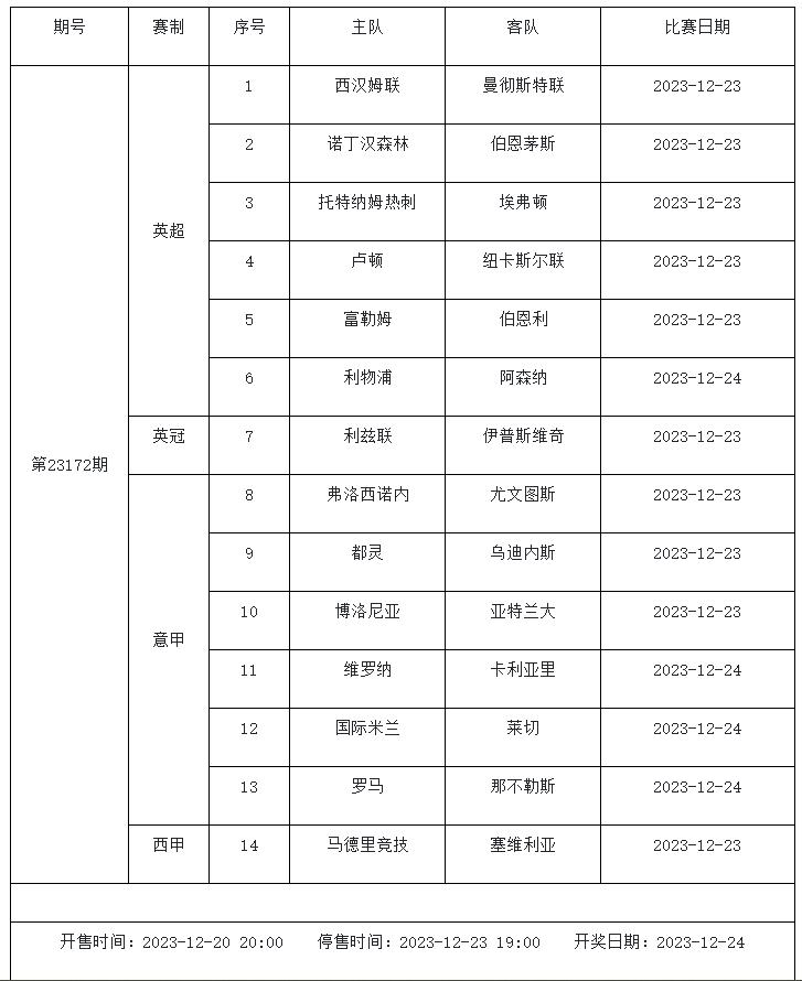 足球彩票勝負(fù)游戲(14場(chǎng)和任選9場(chǎng))第23172期賽程: