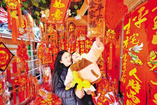 新春將至,年味漸濃。2月12日,在掛滿福字與春聯(lián)的商鋪里,市民懷抱著孩子認(rèn)真挑選,指尖拂過(guò)紅彤彤的春聯(lián)紙,目光里滿是對(duì)新年的期許。