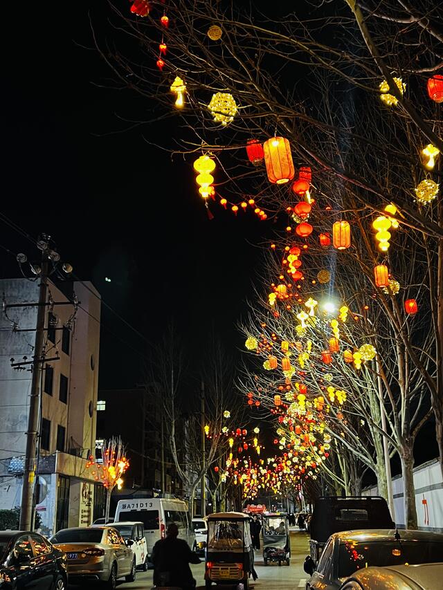 2月18日晚,記者在川匯區(qū)荷花路看到,路旁樹上掛滿了各式各樣的春節(jié)燈飾。紅色的燈籠沿街道綿延鋪展,金色的燈球在晚風(fēng)中輕輕搖曳,光影將這條老街的輪廓勾勒得靈動(dòng)雅致。