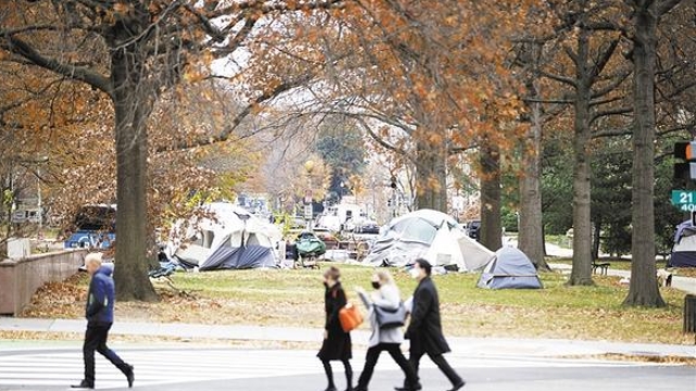 12月8日,在美國華盛頓,行人經(jīng)過無家可歸者居住的帳篷?!?a href="http://www.fjxykj.com/content/2021-12/11/content_962080.html" target="_blank" >[詳細(xì)]