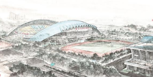 這幅作品以水墨寫實的表現(xiàn),將周口市體育中心的現(xiàn)代建筑之美定格在宣紙上,力求突出城市蓬勃的生命力。