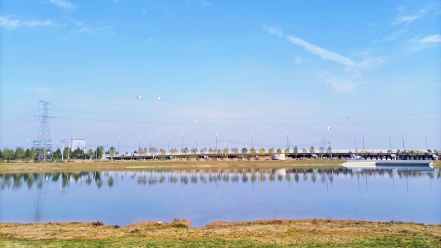 晚秋時節(jié),周口伏羲湖濕地公園風(fēng)景宜人,舉目望去,波光瀲滟的伏羲湖水面上倒映著藍天、白云、飛鳥,“秋水共長天一色”的絕美畫卷讓人心醉。