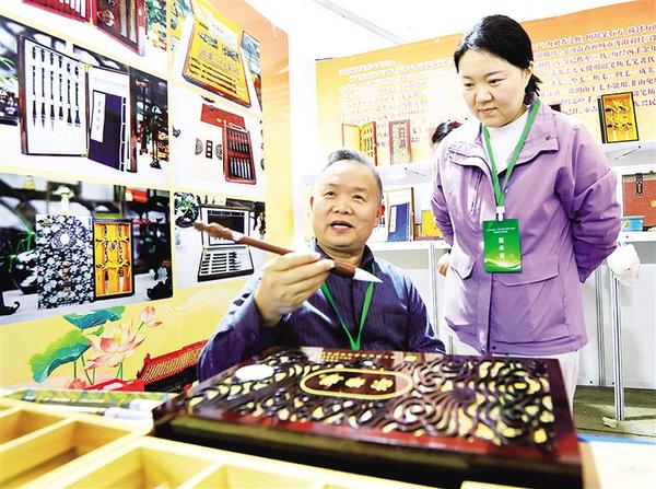 3月1日,在淮陽伏羲文化廣場非遺展示大廳,省級非物質(zhì)文化遺產(chǎn)代表性項目汝陽劉毛筆——御筆坊第67代制筆傳承人劉愛華(右)和父親劉好奎展示毛筆新品。
