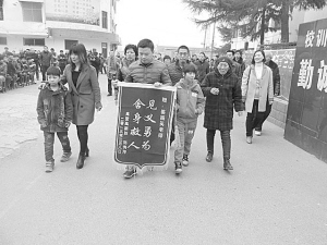 本報(bào)訊 (記者 朱紅 文/圖)3月7日本報(bào)以《姜振英:冰河救起雙胞胎》為題報(bào)道了沈丘縣縣直高中教師姜振英冰河勇救落水雙胞胎的英勇事跡。昨日上午,沈丘縣縣直高中鑼鼓喧天、格外熱鬧。在鑼鼓聲中,得救孩子和親屬一起將一面寫(xiě)有“見(jiàn)義勇為 舍身救人”的錦旗送到姜振英手中。
