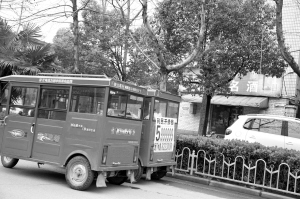 圖④  七一路西段兩輛“紅頂”三輪車并排停放在快車道上,咱能不能換個(gè)安全的地方聊天?!