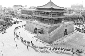 5月5日,由136峰駱駝組成的茶商駝隊(duì)從甘肅張掖鐘鼓樓前走過。