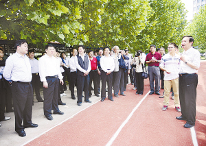 參加河南省推進老年人體育工作現(xiàn)場會的與會人員在市領(lǐng)導(dǎo)徐光、劉繼標等陪同下到星龍華緣小區(qū)參觀老年人健身場地。