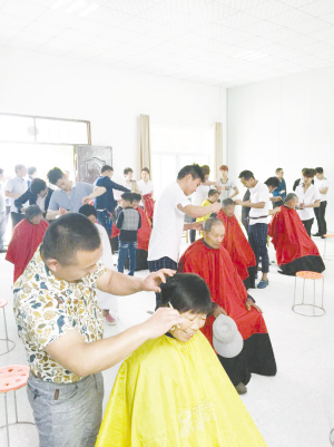 5月4日,團(tuán)縣委組織29家理發(fā)店50名理發(fā)師,在縣老干部活動(dòng)中心開展了慶“五四”免費(fèi)為環(huán)衛(wèi)工人義剪獻(xiàn)愛心活動(dòng)。200多名環(huán)衛(wèi)工人在理發(fā)師的精心打理下發(fā)型煥然一新,精神抖擻。(團(tuán)軒 攝)