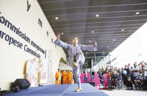 “中國角”首次現(xiàn)身歐盟開放日      5月9日,在比利時首都布魯塞爾歐盟委員會大樓下,中國武僧表演功夫。當日是歐盟一年一度的開放日。因今年恰逢中歐建交40周年,中國成為歐盟成員國外唯一一個開設(shè)宣傳角的國家,也是1993年歐盟舉辦開放日以來中國首次參加,為今年的開放日增添了不少中國元素。新華社發(fā)