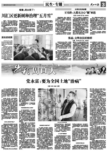“近年來(lái)土壤酸化板結(jié)速度加快,所有土地遭受不同程度的農(nóng)資次生災(zāi)害。建議各級(jí)黨委和政府及有關(guān)部門(mén)應(yīng)盡早重視土地污染治理工作,牽頭組織相關(guān)部門(mén),爭(zhēng)取盡快在全市范圍內(nèi)宣傳、推廣和應(yīng)用土地污染治理技術(shù),逐步向全國(guó)受污染的土地開(kāi)戰(zhàn),為子孫留下更多的凈土?!秉h永富說(shuō),這是他的夢(mèng)想。