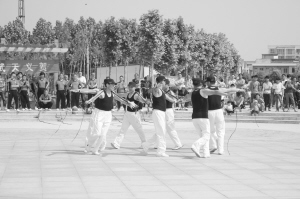 為進(jìn)一步推動(dòng)全民健身活動(dòng)的深入開展,項(xiàng)城市啟動(dòng)了“全民健身月”活動(dòng),讓市民積極投身到全民健身行列中,努力使體育鍛煉經(jīng)?;€(gè)人健身生活化。圖為5月18日項(xiàng)城市鞭陀協(xié)會(huì)的會(huì)員正在進(jìn)行鞭陀健身展演。