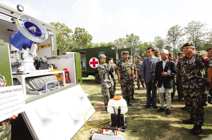 5月25日,在尼泊爾首都加德滿都,尼泊爾軍隊總參謀長拉納(前右一)在中國駐尼泊爾大使吳春太(前右三)的陪同下參觀中國捐贈的野戰(zhàn)醫(yī)院設備。