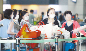 韓國(guó)又確診中東呼吸綜合征患者      5月30日,在韓國(guó)仁川國(guó)際機(jī)場(chǎng),佩戴口罩的乘客排隊(duì)等候辦理登機(jī)手續(xù)。韓國(guó)保健福祉部30日例行通報(bào)說,當(dāng)日新確診了1例中東呼吸綜合征患者。至此,韓國(guó)國(guó)內(nèi)確診的患者已增至12人,另有一名韓國(guó)患者在中國(guó)被確診。新華社發(fā)