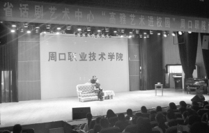 6月9日下午,由河南省教育廳、文化廳、財(cái)政廳主辦的2015年“高雅藝術(shù)進(jìn)校園”——省話劇藝術(shù)中心專場(chǎng)演出在周口職業(yè)技術(shù)學(xué)院礪德廳舉行。激情的舞臺(tái)對(duì)白、絢麗的歌舞場(chǎng)景,話劇藝術(shù)中心的演員們聯(lián)袂為800余名師生獻(xiàn)上了一場(chǎng)視聽盛宴。(孫先鋒 攝)