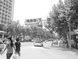8月14日,周口市區(qū)七一路與中州大道交叉口的一處紅綠燈發(fā)生故障,工人冒著高溫酷暑及時(shí)進(jìn)行搶修,確保交通安全。晚報(bào)記者 張洪濤 攝
