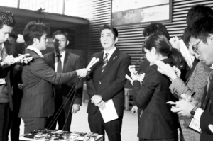 日本首相安倍晉三(中)接受記者采訪。